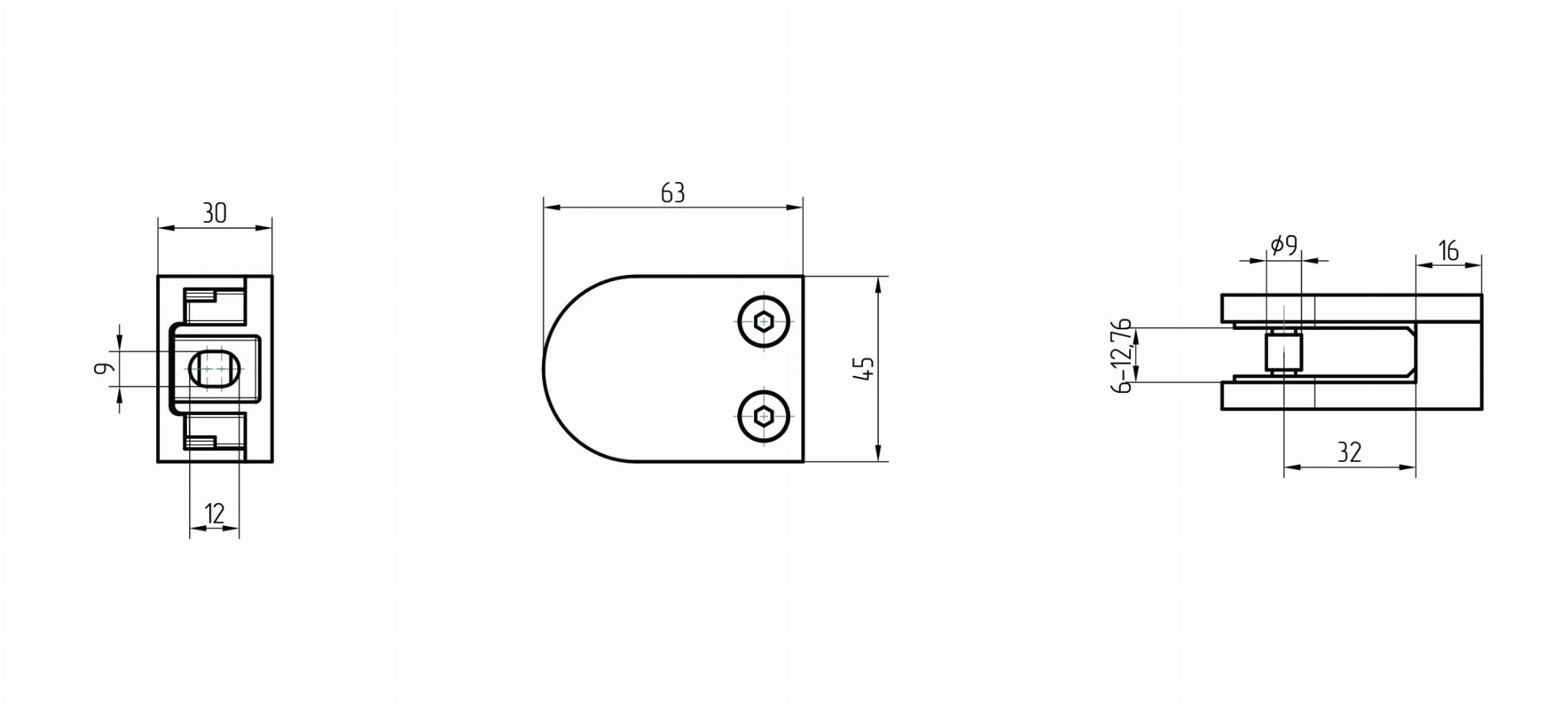 Abrazaderas para vidrio 45x63mm para superficies planas, ZAMAK, RAL 9005 (6-12,76mm)