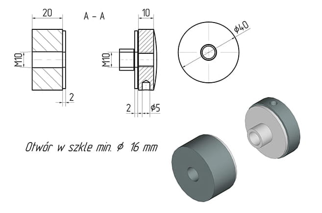 Adaptador de vidrio 40/20mm rosca M10, AISI 304, SATINADO