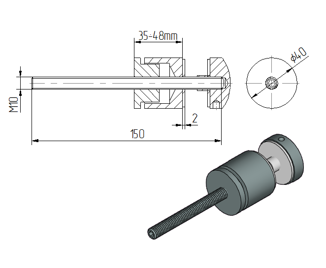 Adaptador de vidrio Ø40 mm, distancia regulable 35-48 mm, AISI 304, SATINADO