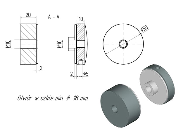 Adaptador de vidrio 50/20mm rosca M10, AISI 304, Pulido