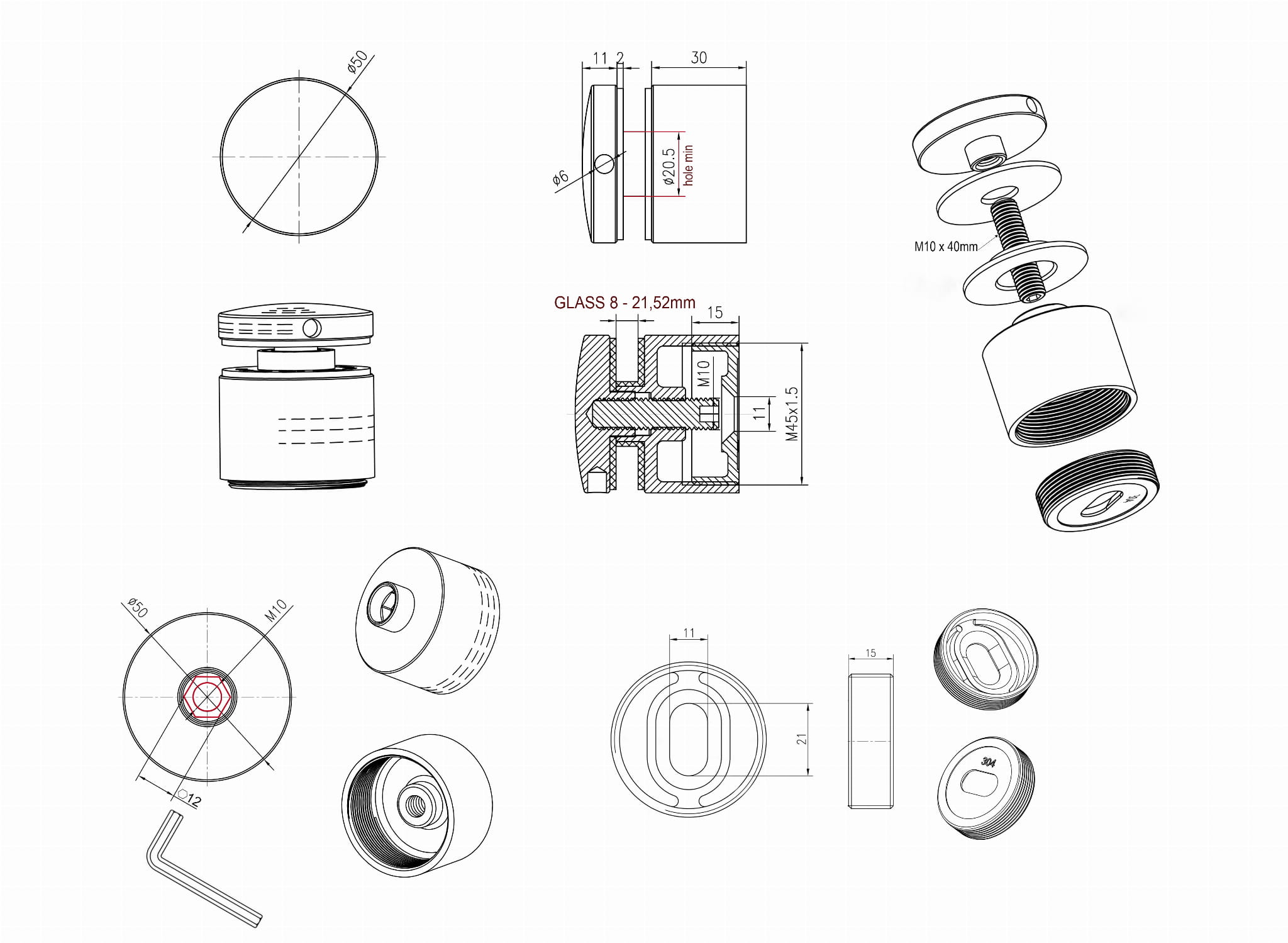 Para vidrio de 8-21,52 mm