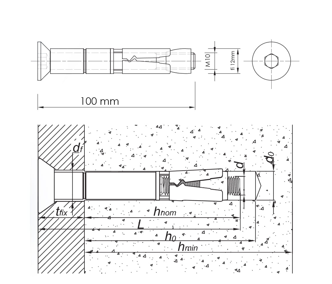 - Longitud del anclaje de expansión 100 mm, diámetro exterior Ø12 mm