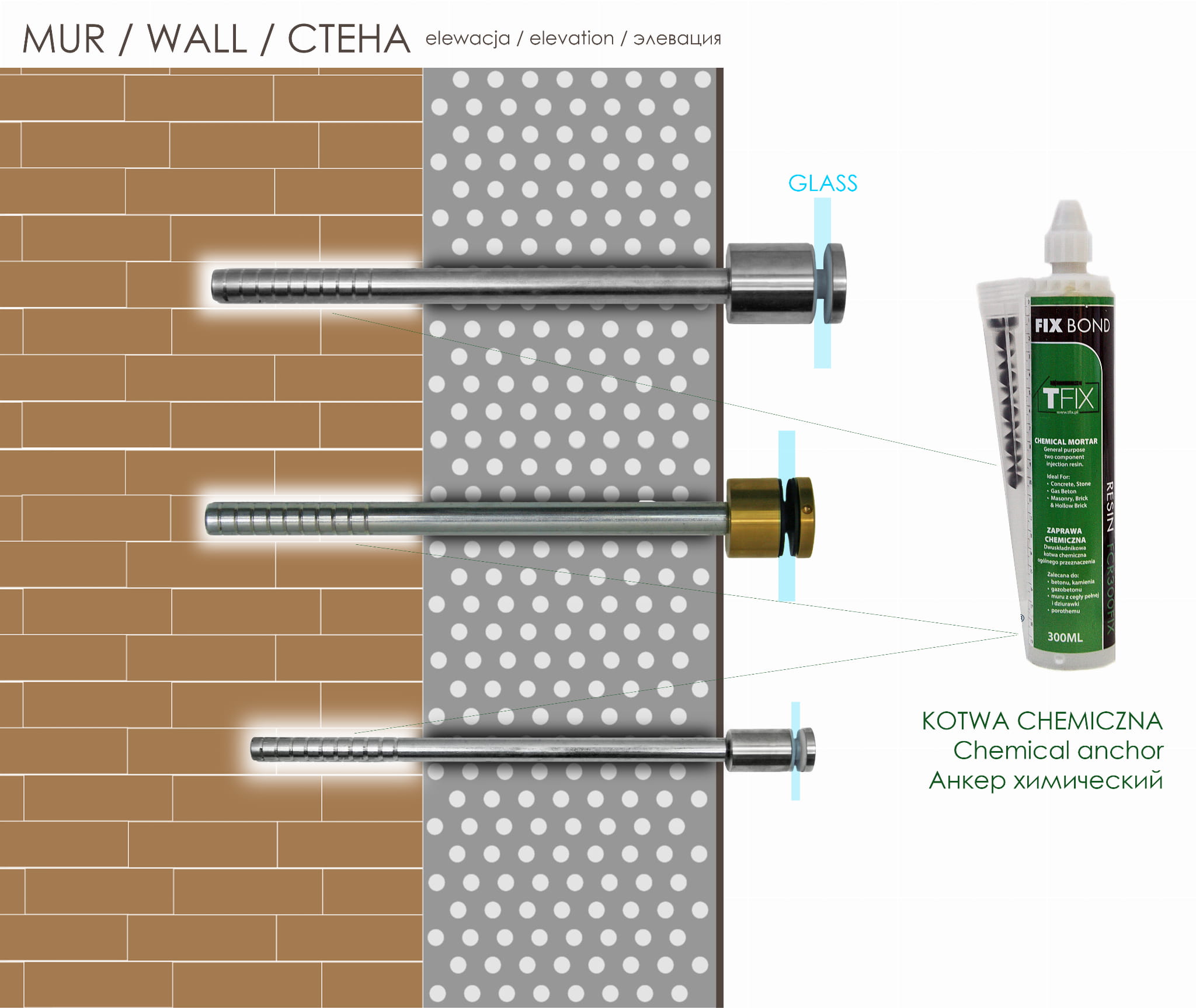 - La longitud de la varilla de montaje está diseñada para fijar un soporte puntual y otros elementos de fijación en un edificio con fachada de hasta un grosor máximo de 220mm.