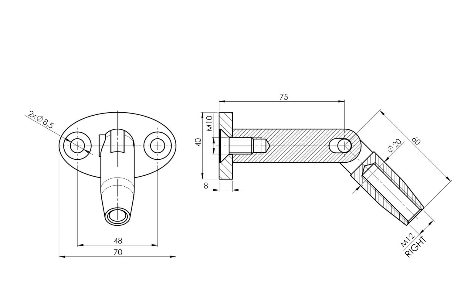 • Montaje de los elementos a la superficie de fijación sobre una base en forma de elipse con dos orificios de montaje para tornillo DIN 7991 M8