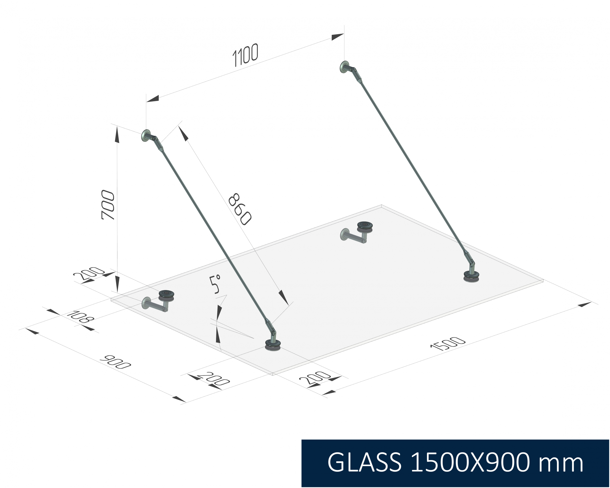 Fijación de marquesina CNP Ø 60 mm + VIDRIO 66.4 VSG/ESG 1500x900 mm, AISI 304, SATINADO