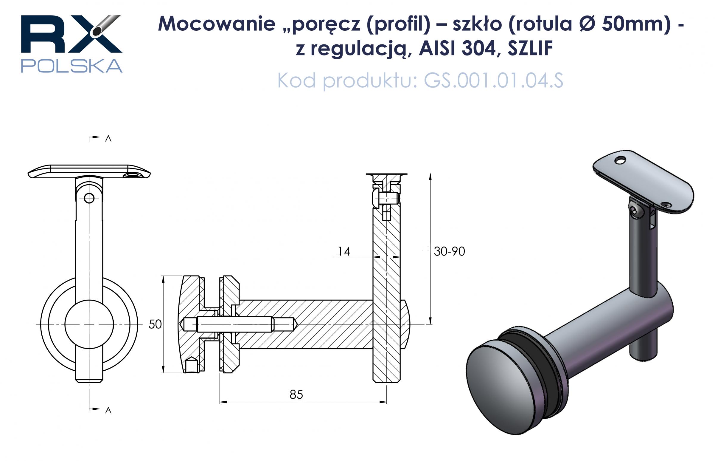 Fijación pasamanos (perfil) – vidrio (rótula Ø 50mm), AISI 304, SATINADO