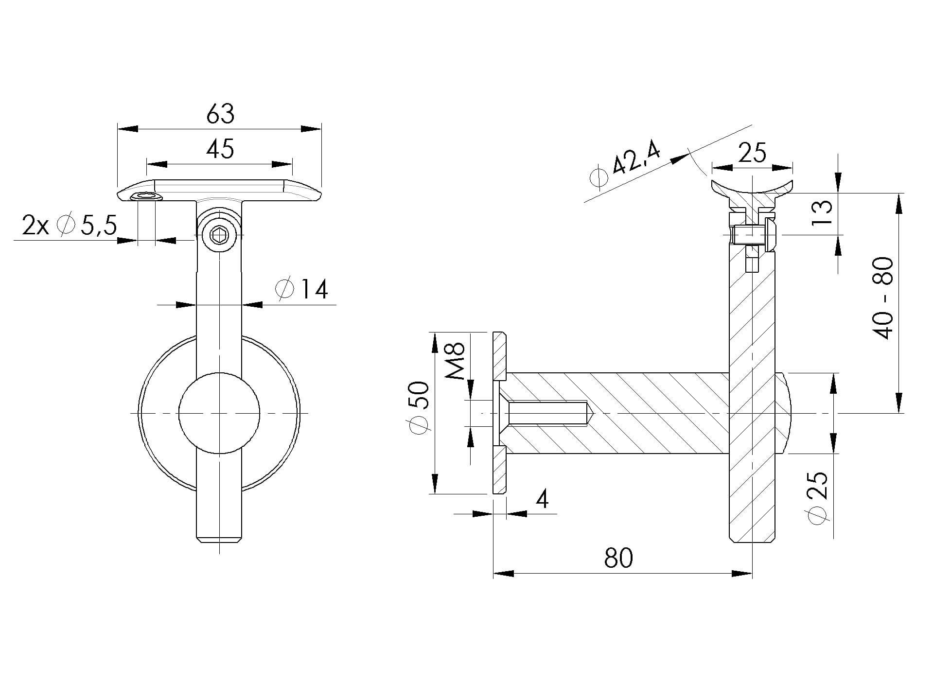 - Distancia desde la superficie de apoyo hasta el eje del soporte del pasamanos: 80mm