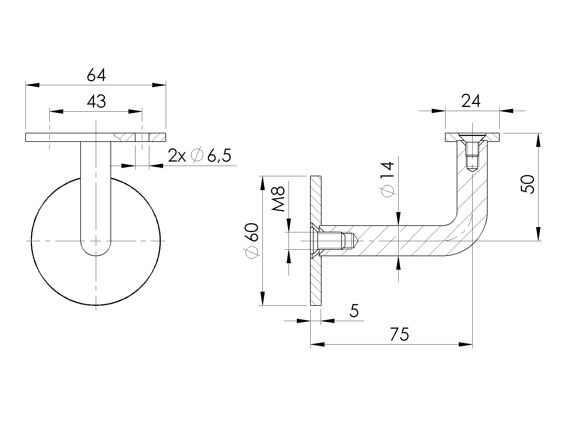 - La fijación a un pasamanos plano con un diámetro de disco de 60 mm y un tamaño de varilla de 75x50 mm fi 14 mm es una solución ideal para la instalación de pasamanos de barandillas.