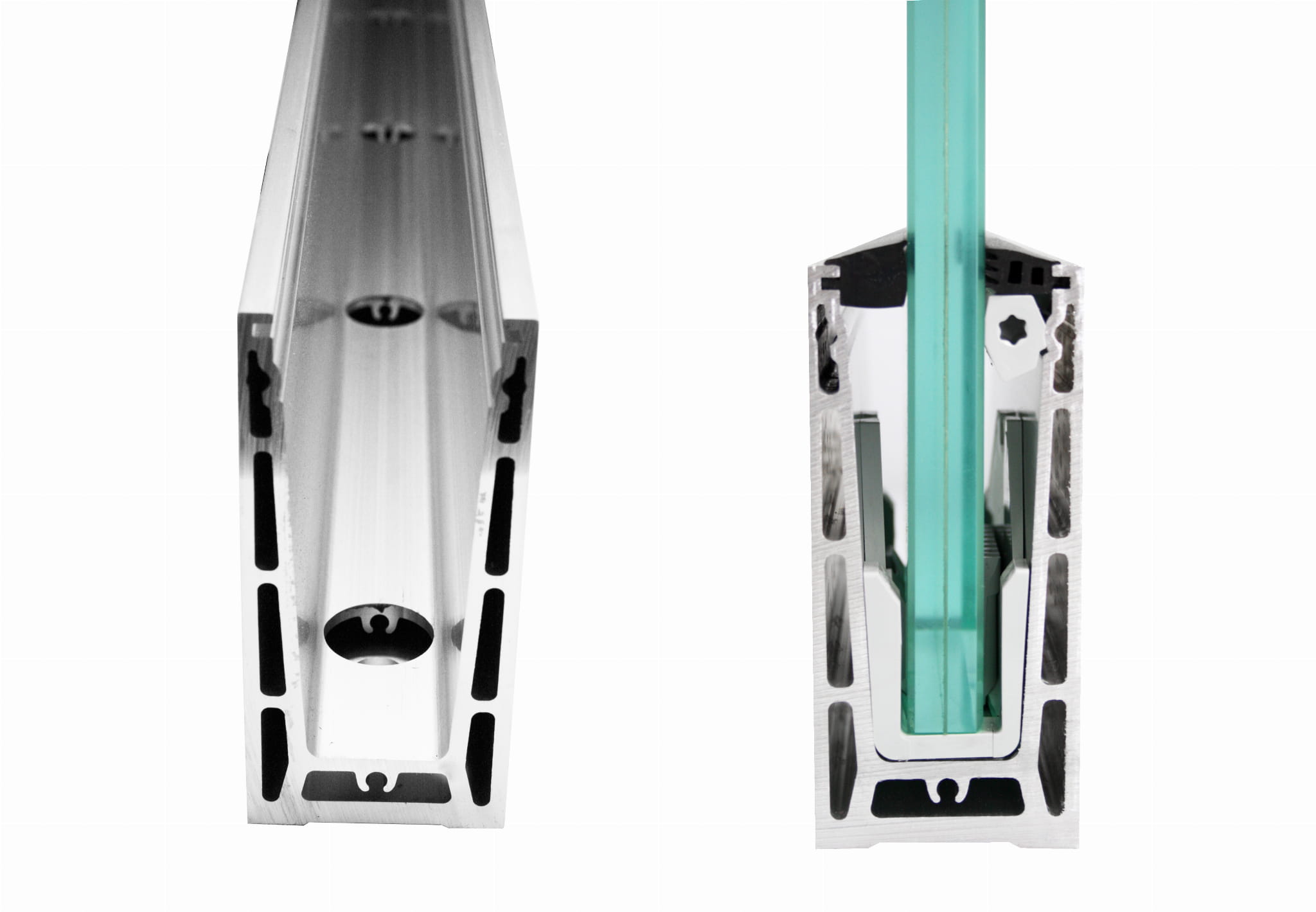 - Montaje de perfil en U desde arriba con ajuste vertical del vidrio
