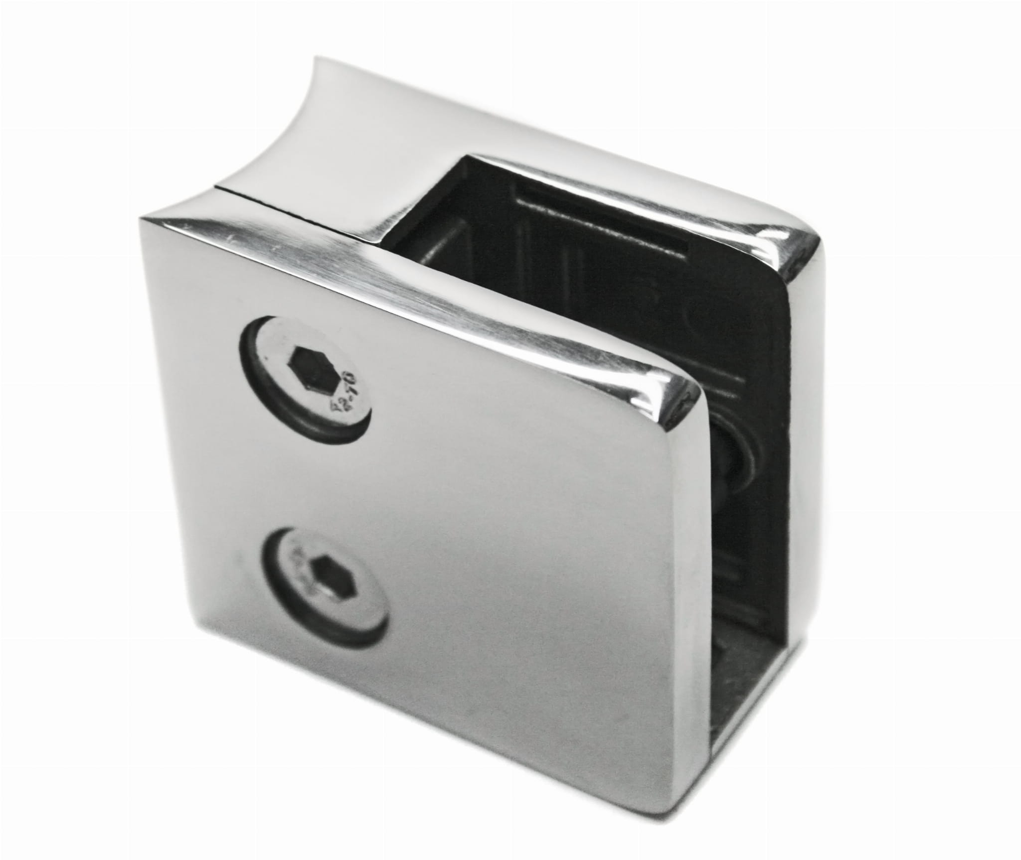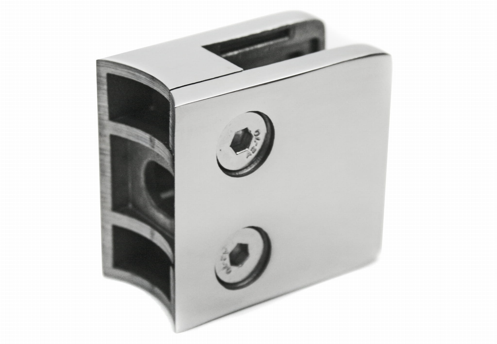 Pinzas para vidrio45x45 con placa de seguridad para tubo 42,4 mm, AISI 304, Pulido