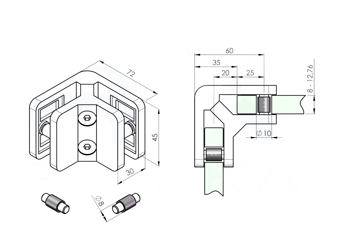 Pinzas para vidrio45x63mm, 8-12.76mm, AISI 304, SATINADO
