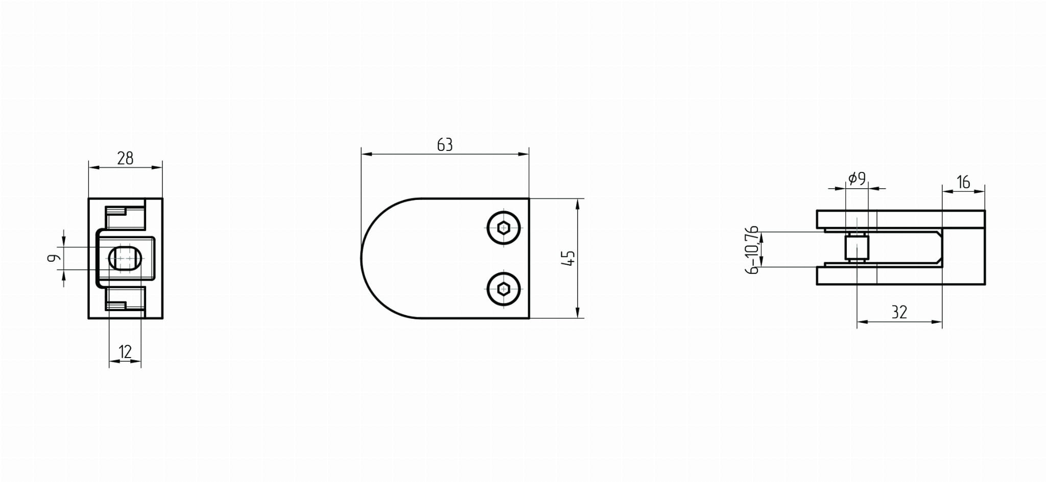Pinzas para vidrio45x63mm para superficie plana, AISI 304, SATINADO (6-10,76mm)