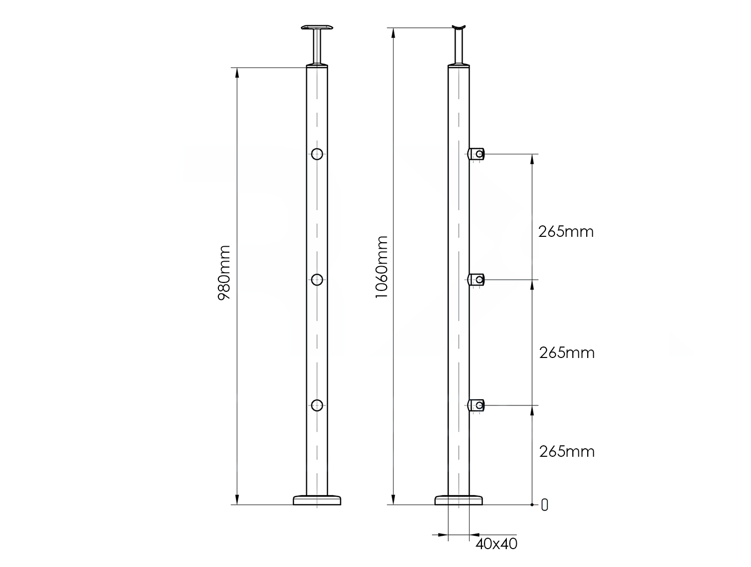 Poste 40x40 mm 1060 mm con 3 soportes de travesaño para tubo de 12 mm, AISI 304, SATINADO