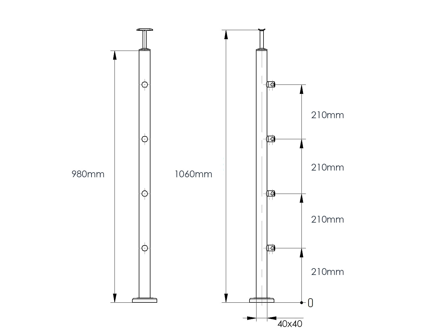 - Base del poste – 85x85x4mm, 4 orificios de montaje para varilla máx. M10