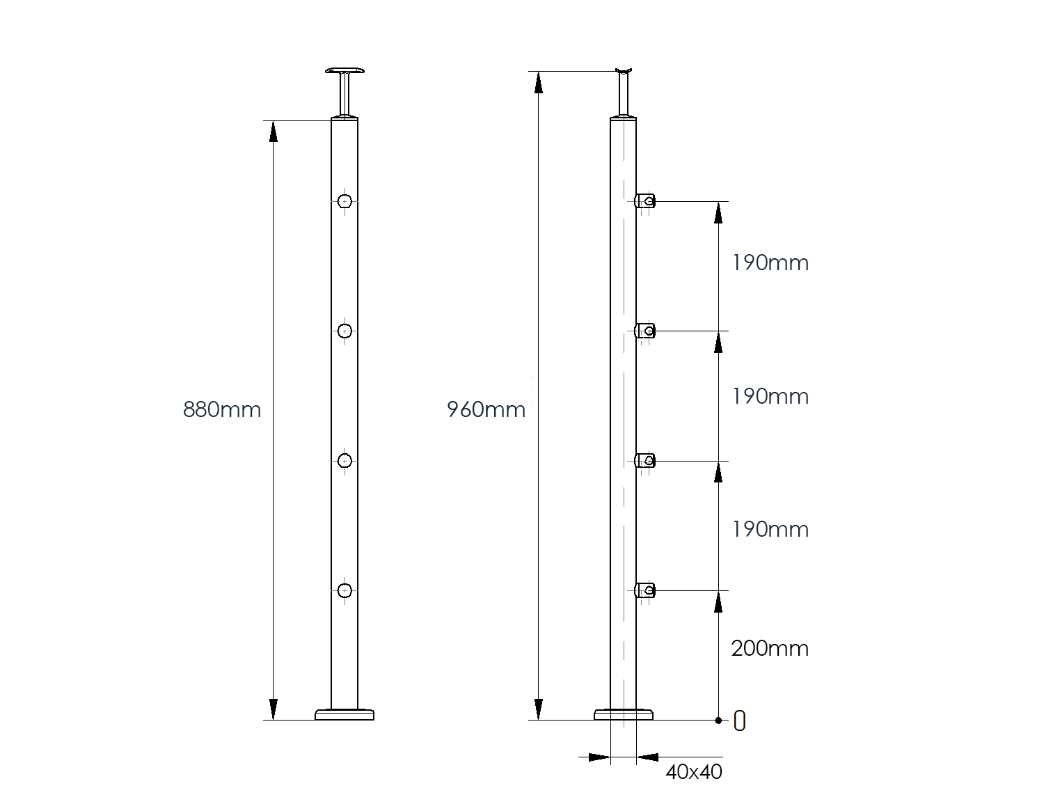 Poste 40x40 mm 960 mm con 4 soportes de travesaño para tubo de 12 mm, AISI 304, SATINADO