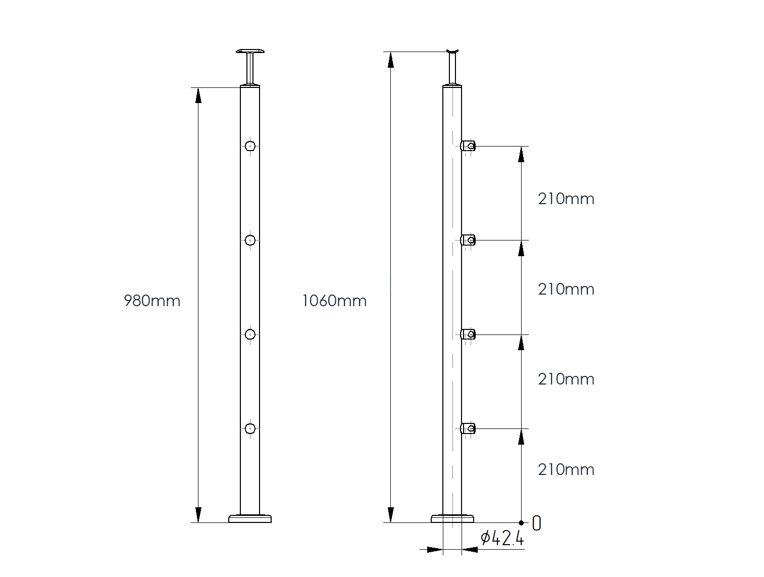 Poste Ø42,4 mm 1060 mm con 4 soportes de travesaño para tubo de 12 mm, AISI 304, SATINADO