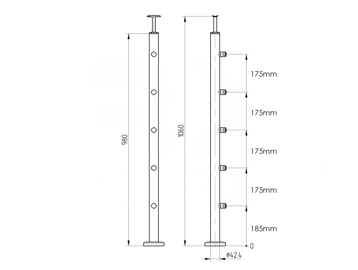 Poste Ø42,4 mm 1060 mm con 5 soportes de travesaño para tubo de 12 mm, AISI 304, SATINADO