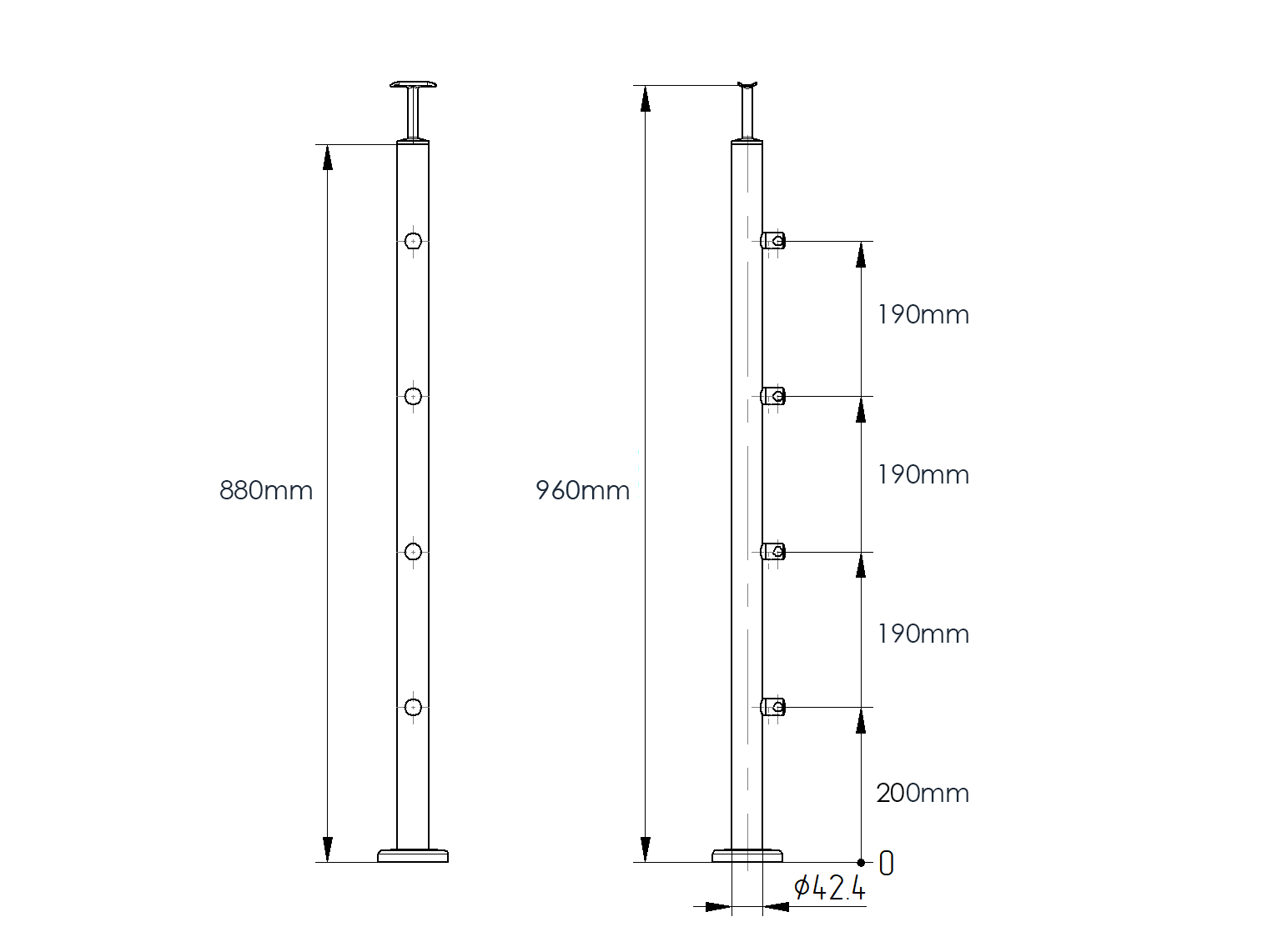 Poste 42,4mm 960mm con 4 soportes para barras transversales para tubo 12mm, AISI 304, SATINADO