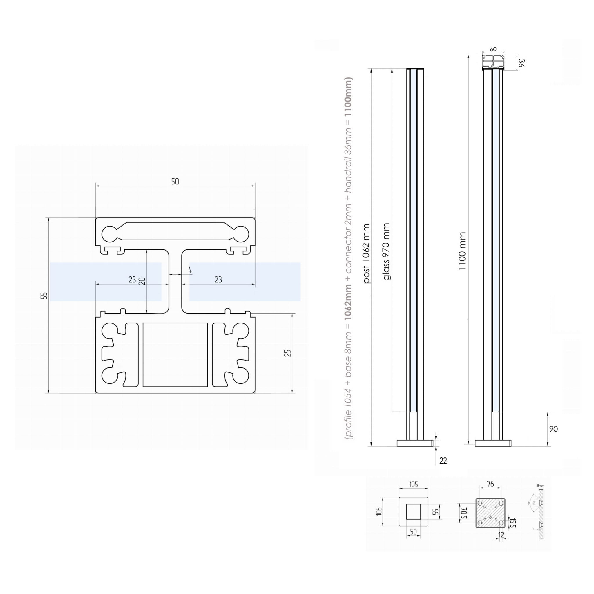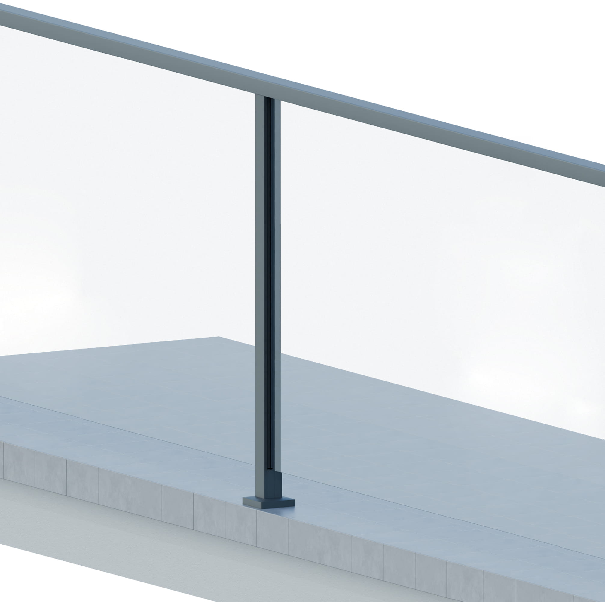 - Poste (perfil + base (espesor 8 mm) atornillados entre sí) + chapa superior de 2 mm de espesor (conector de pasamanos con poste)