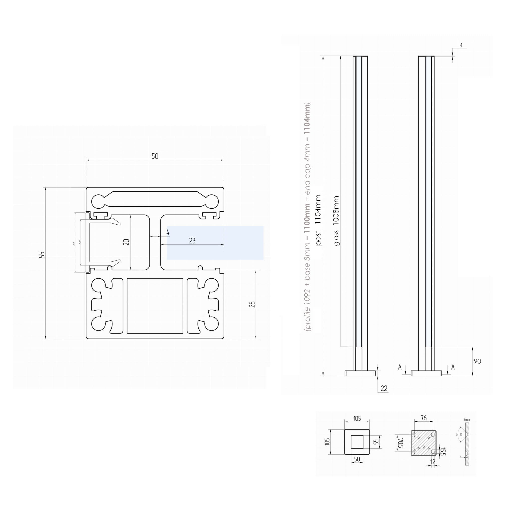 - Poste (perfil + base (espesor 8 mm) atornillados entre sí) + tapa superior (espesor 2 mm)