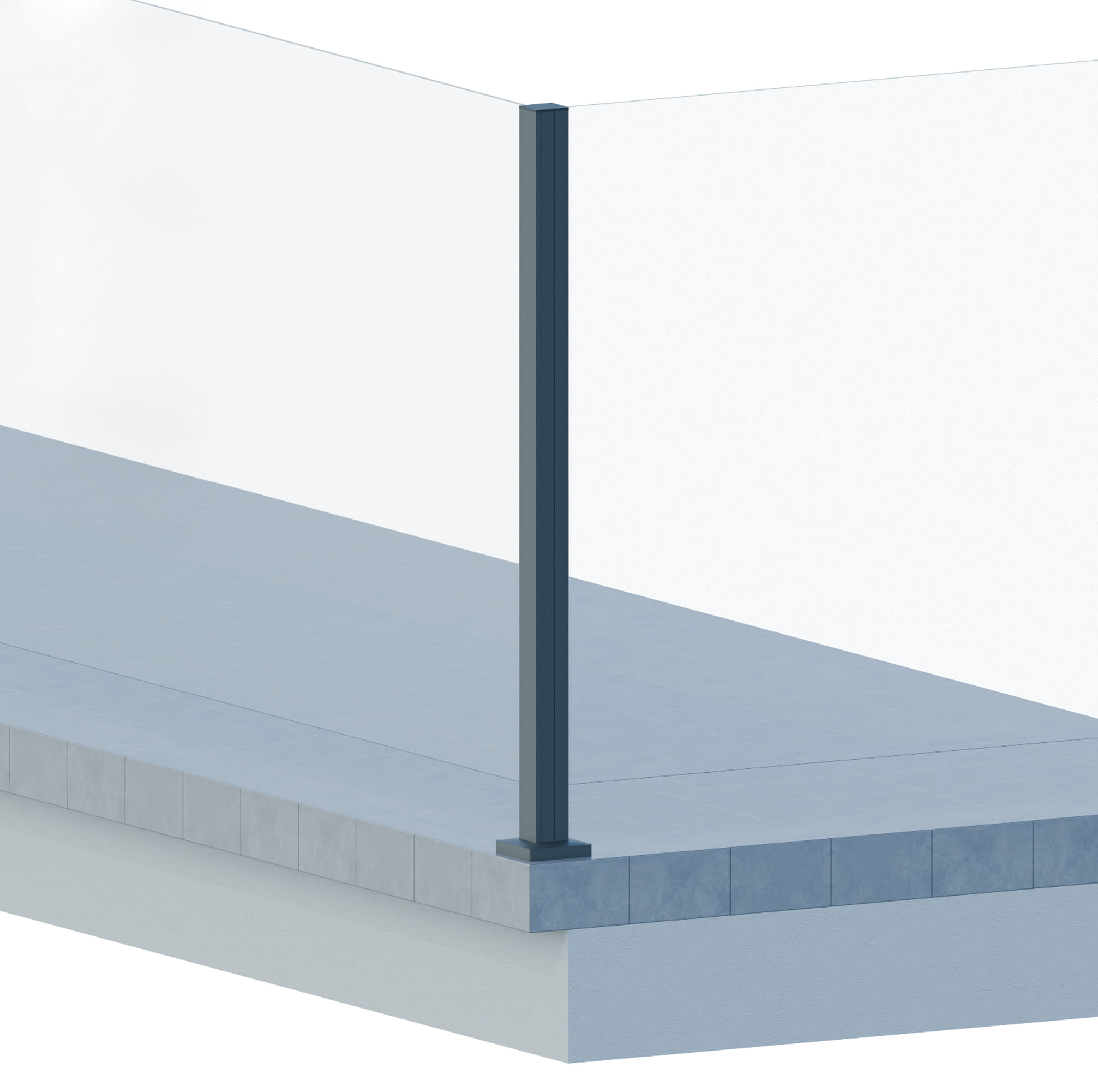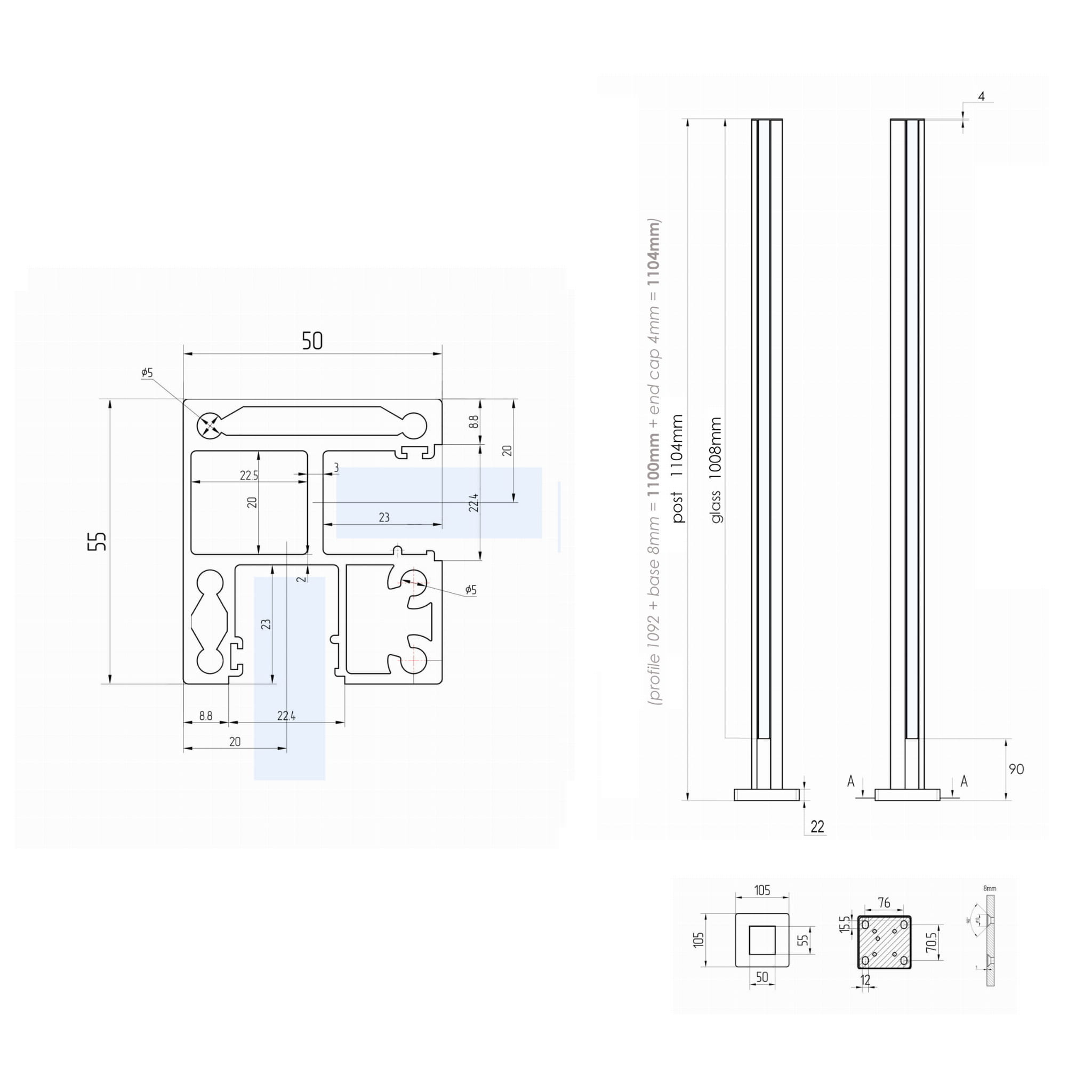 - Poste (perfil + base (espesor 8 mm) atornillados juntos) + tapa superior (espesor 2 mm)