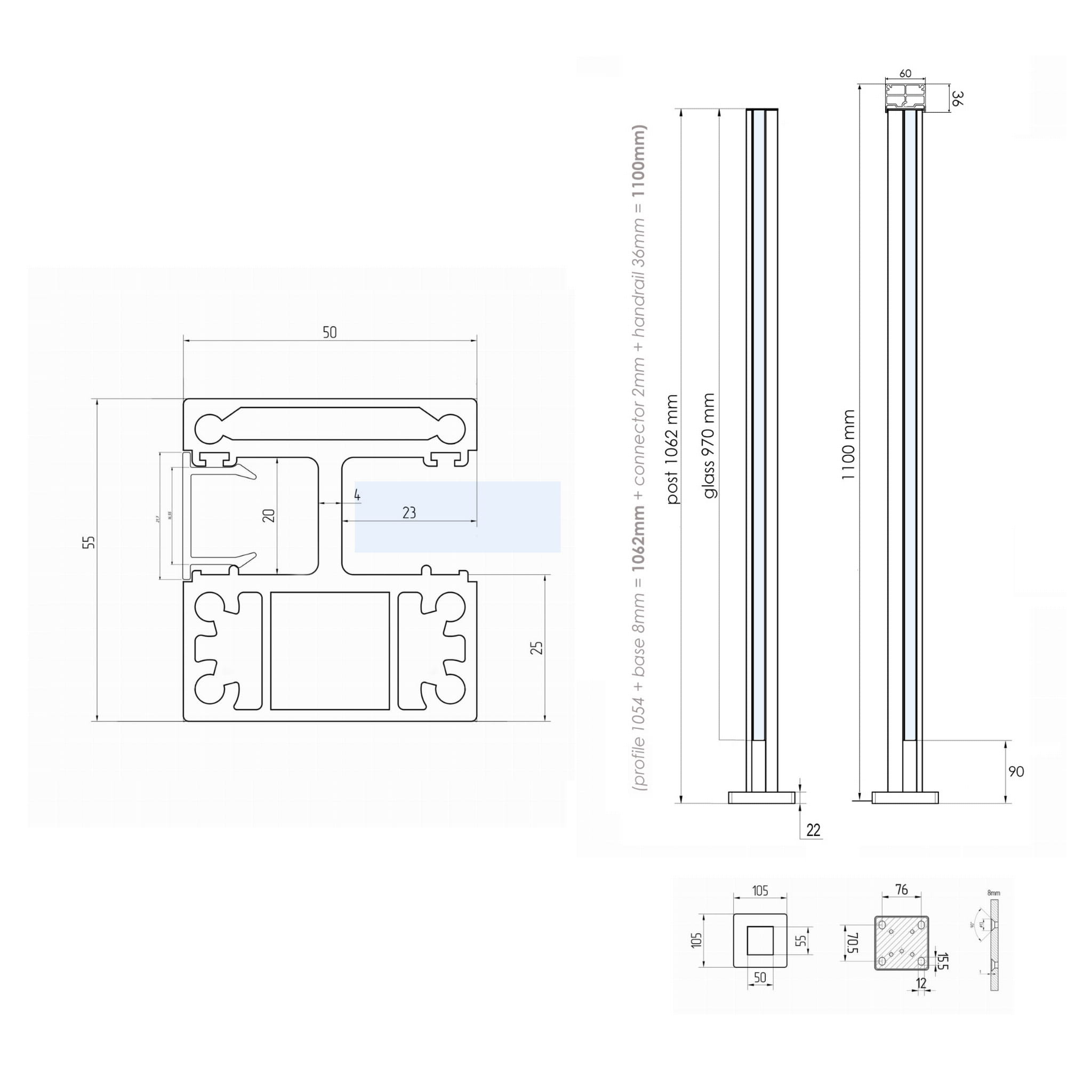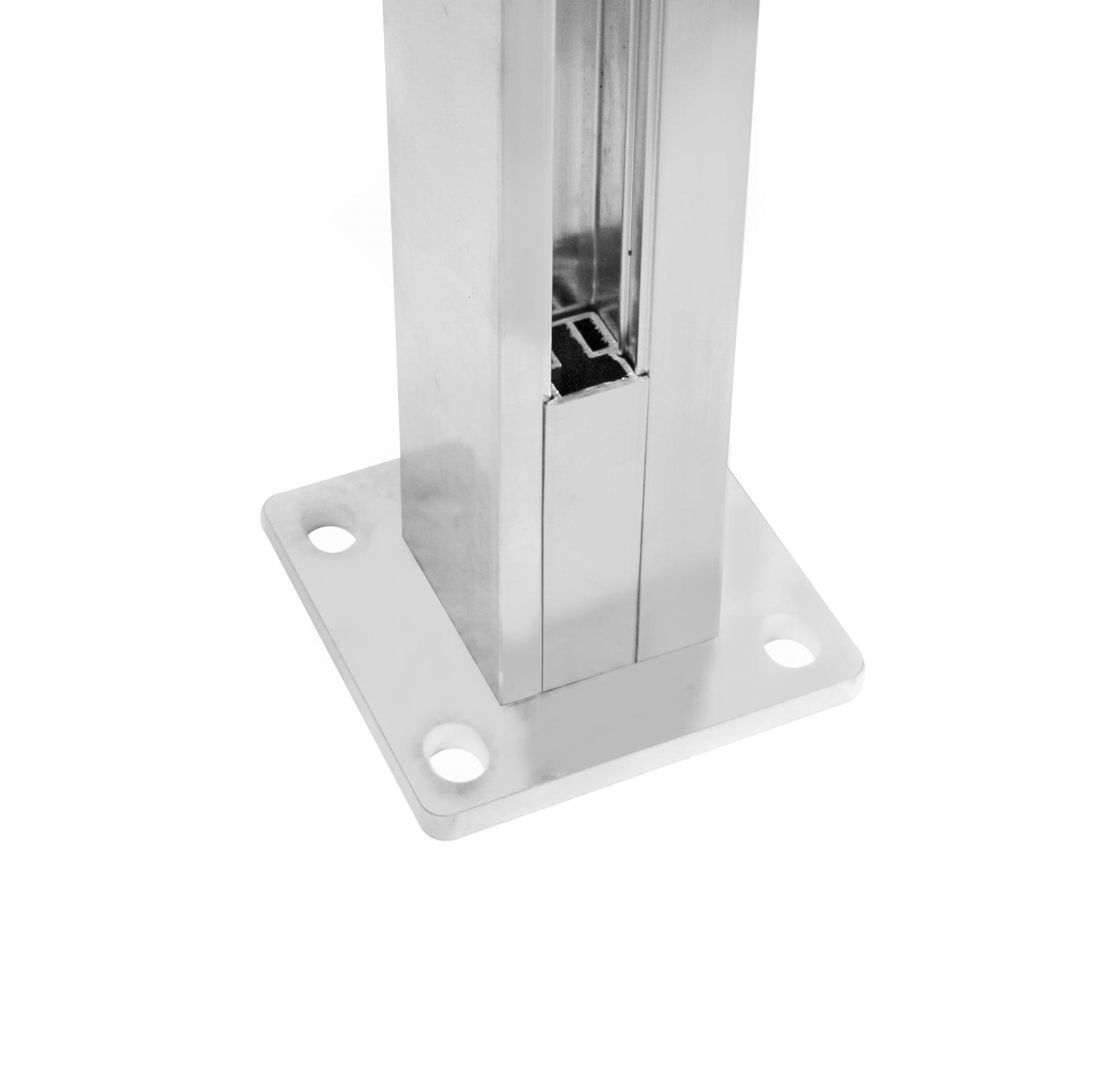 - Poste (perfil + base (espesor 8 mm) atornillados entre sí) + chapa superior de metal de 2 mm de espesor (conector del pasamanos con el pilar)