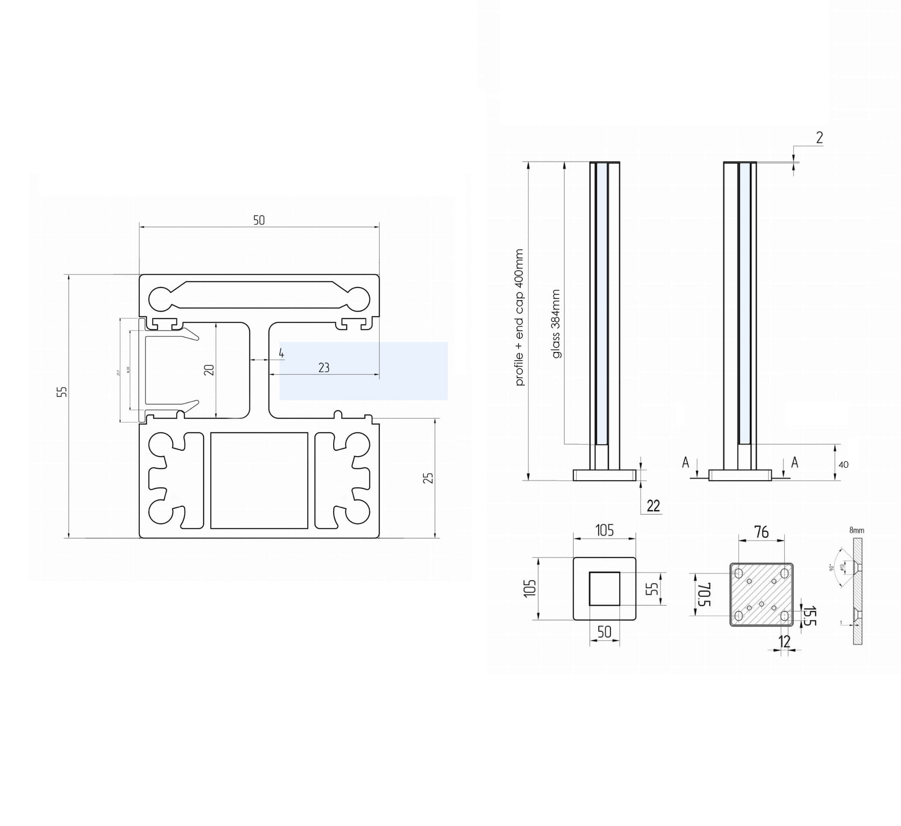 - Poste (perfil + base (espesor 8 mm) atornillados juntos) + tapa superior (espesor 2 mm)