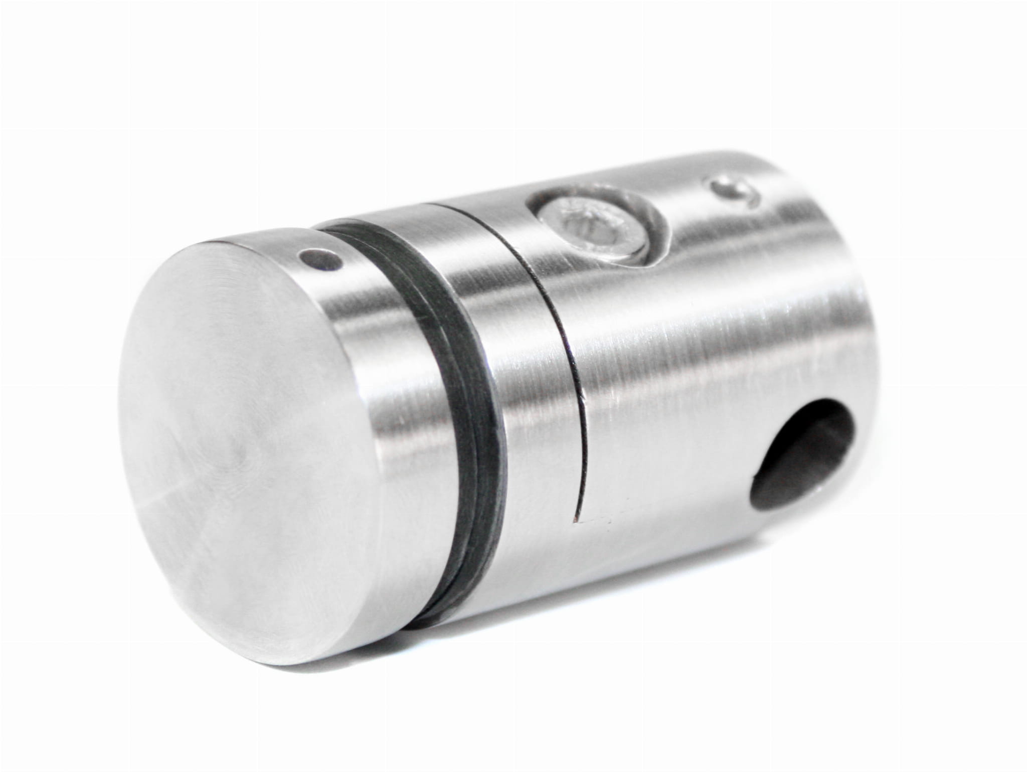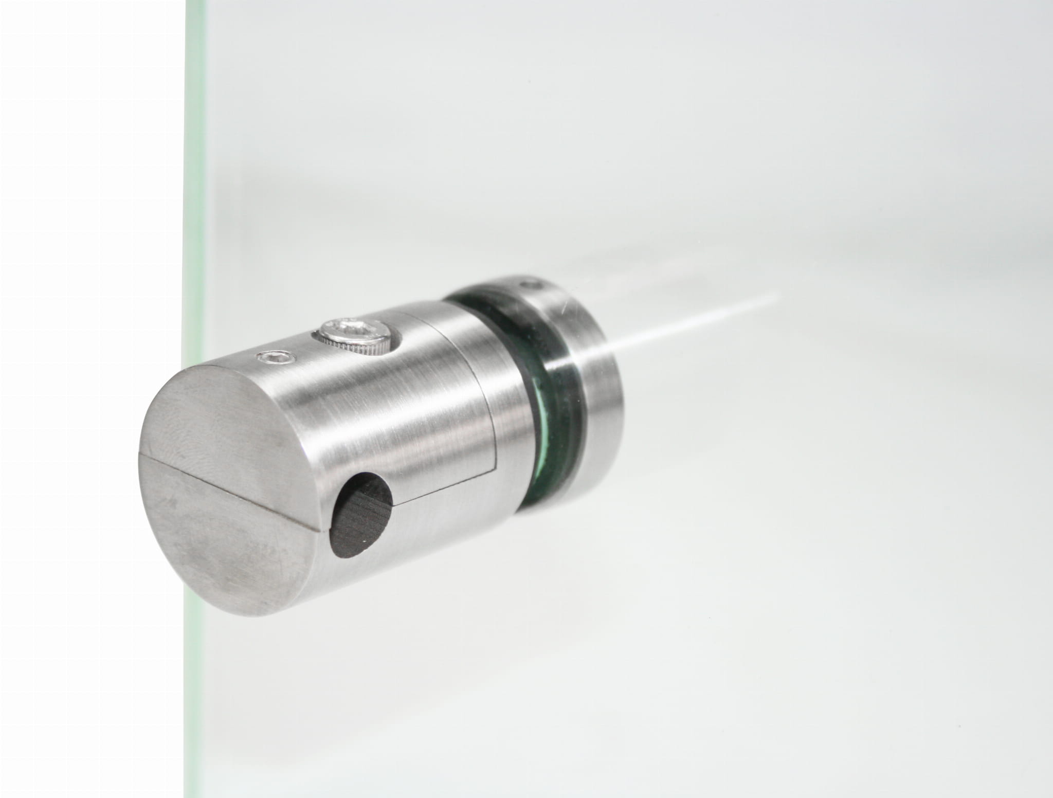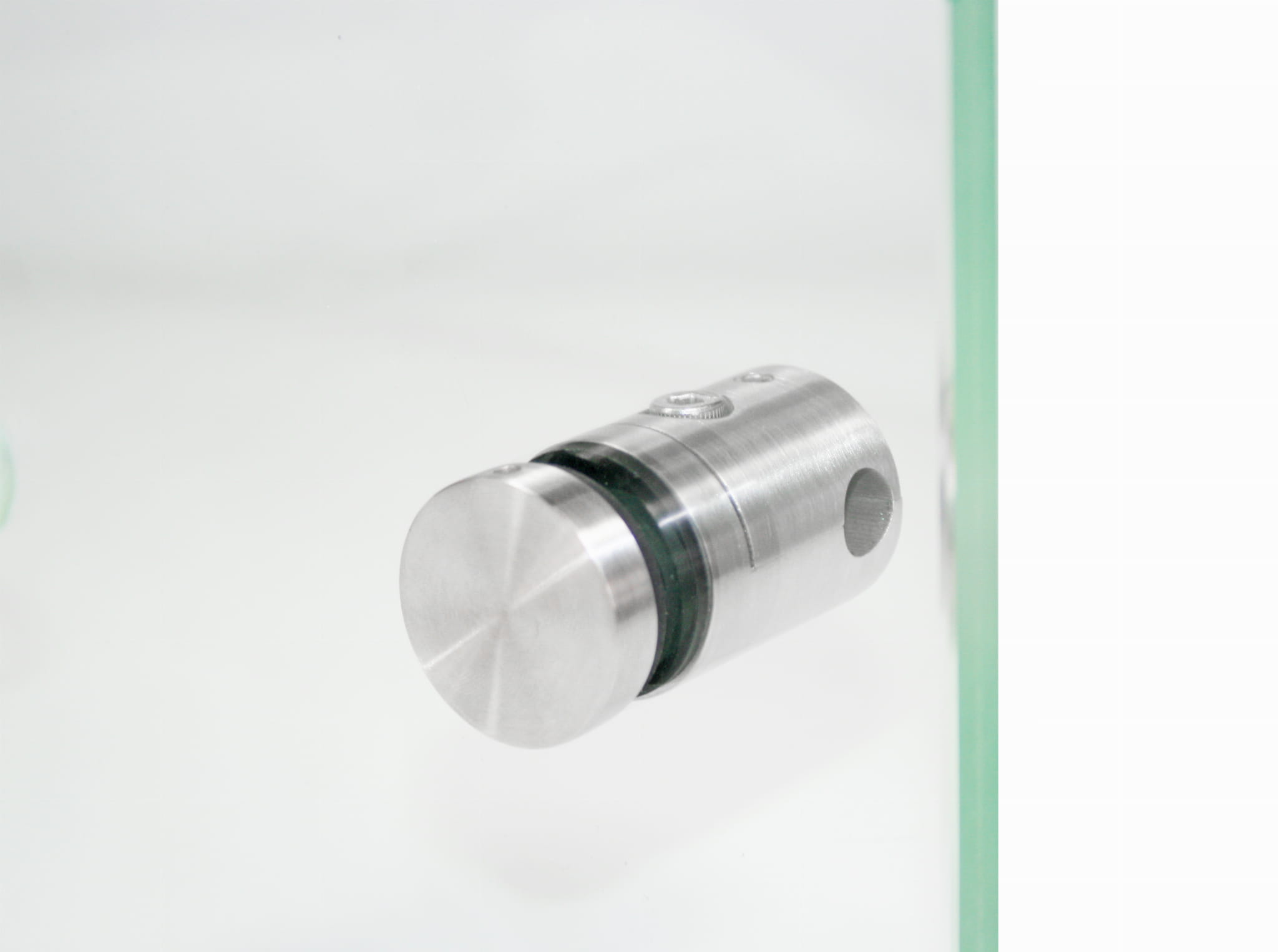 - El casquillo está dividido en 2 partes, lo que permite instalar el vidrio en barandillas ya montadas con tubos, sin necesidad de desenroscarlos previamente.