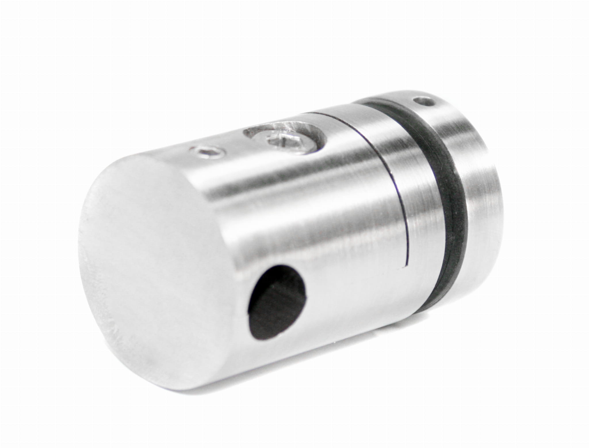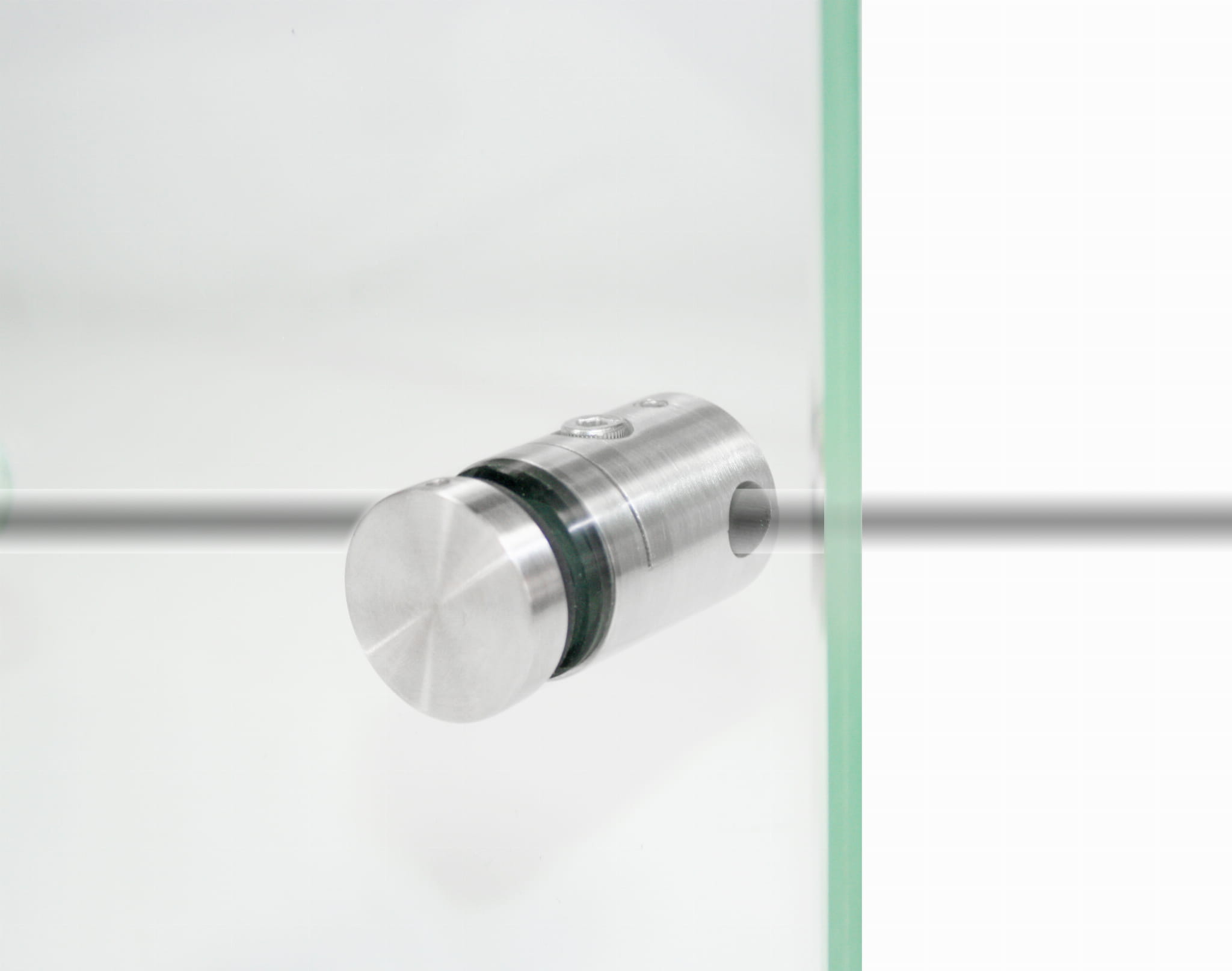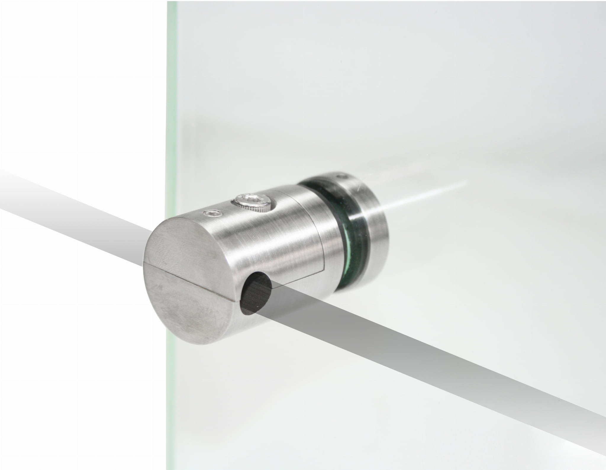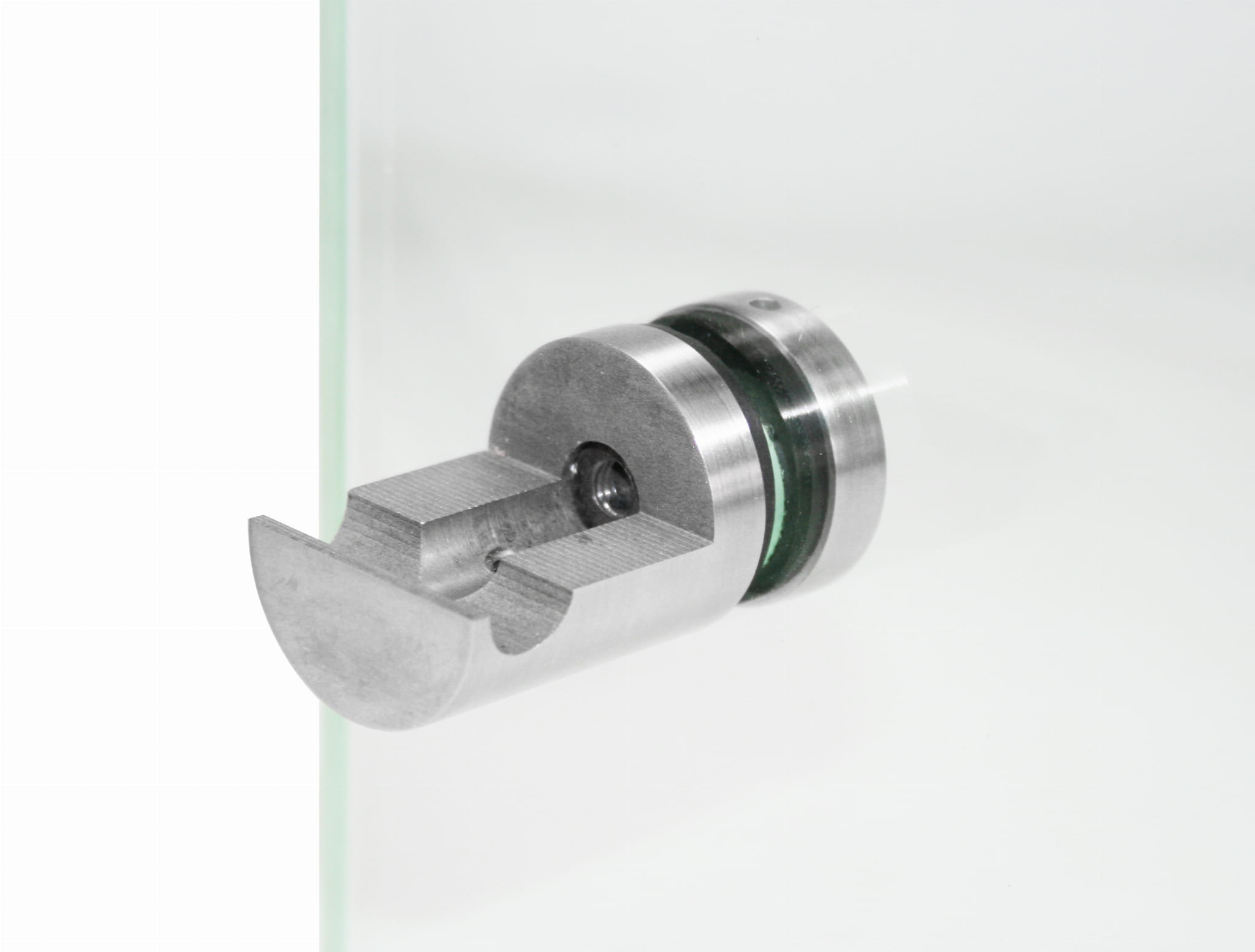 - El casquillo está dividido en 2 partes, lo que permite instalar el vidrio en barandillas ya montadas con tubos, sin necesidad de desenroscarlos previamente.