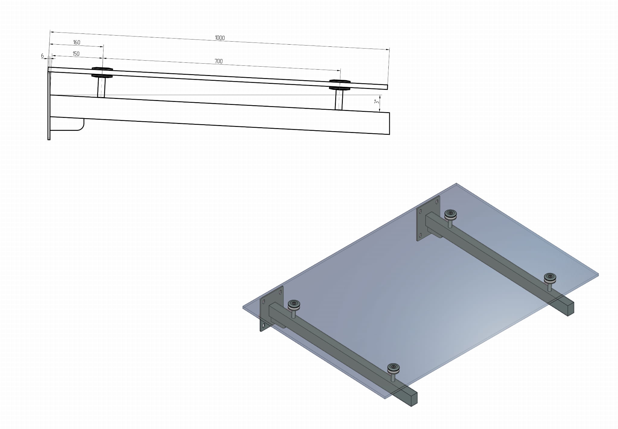 - Soporte para marquesina de vidrio hecho de perfil 60x40 mm (perfil soldado a una base de 200x160x6 mm)