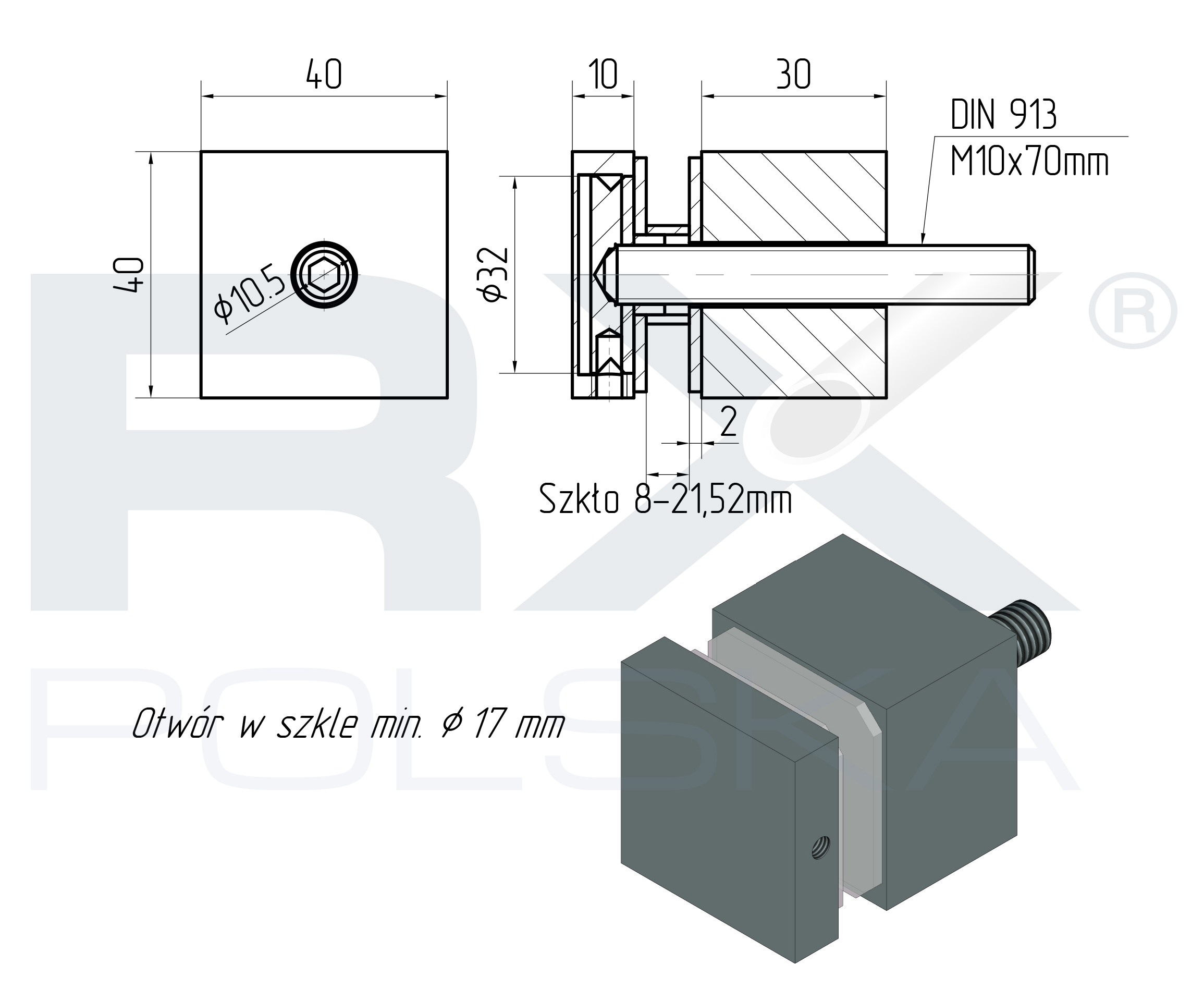 Soporte para vidrio 40x40mm, dist. 30mm, AISI 304, SATINADO
