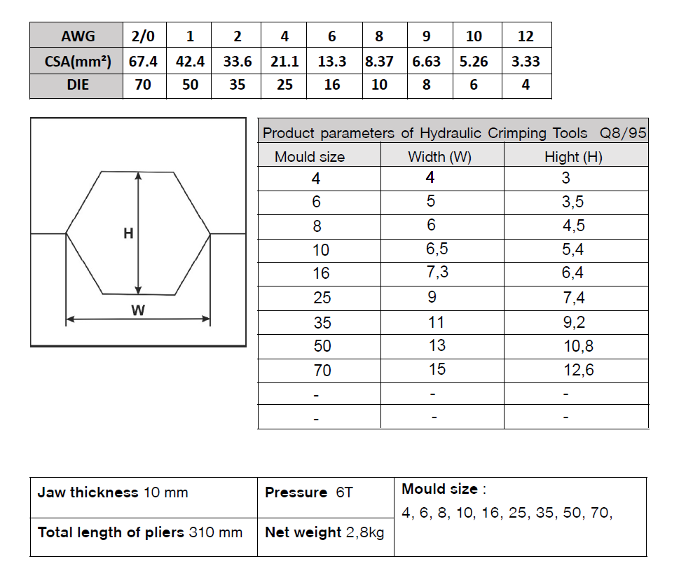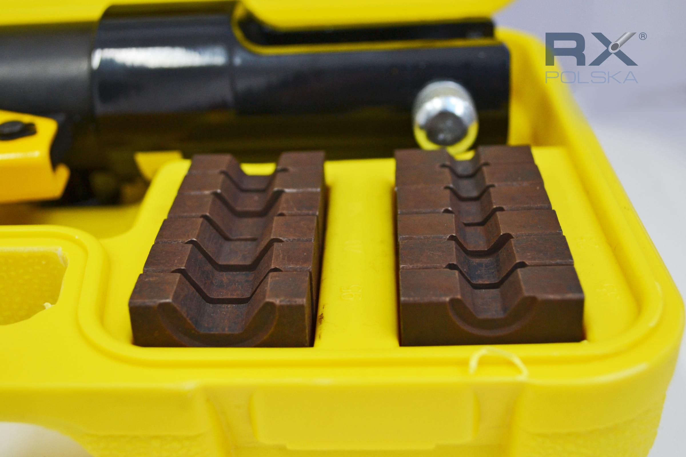 - Esta herramienta funciona según el principio de la presión hidráulica, lo que garantiza un prensado uniforme y fuerte del conector sobre la cuerda, asegurando la durabilidad y la seguridad de la unión.