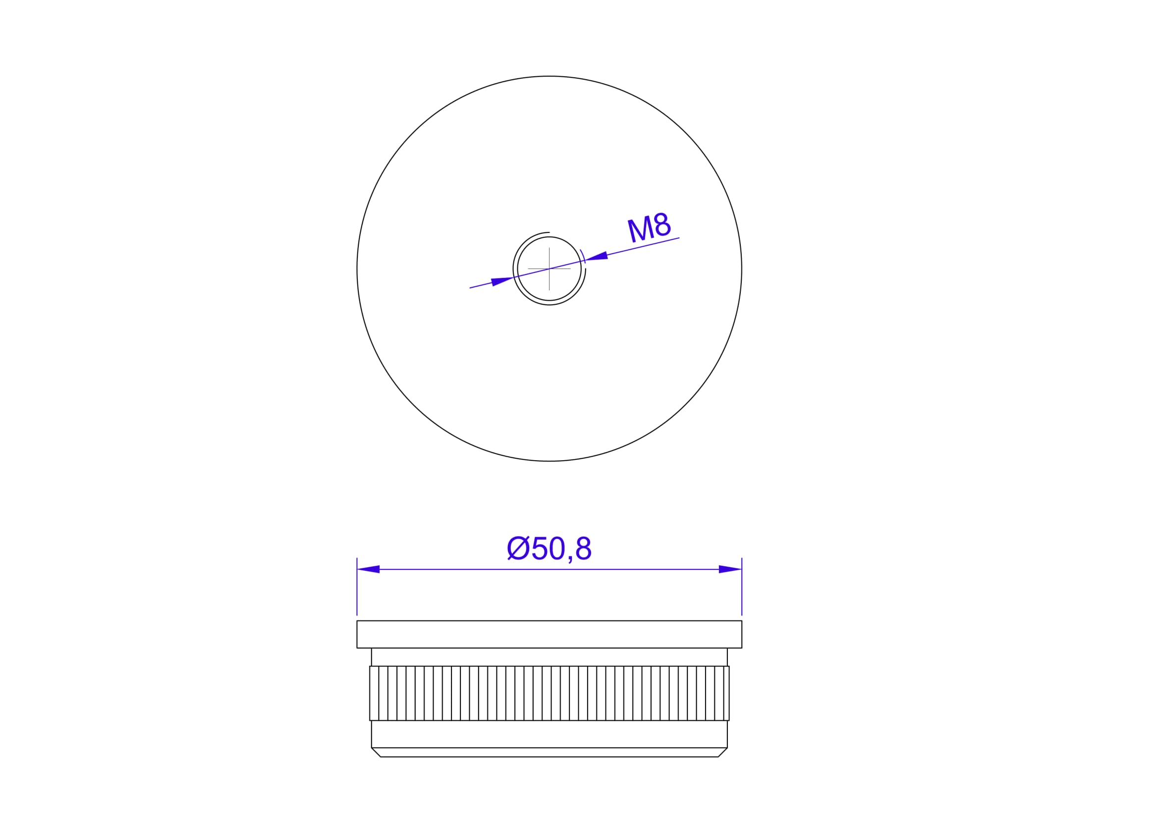 Tapa terminal para tubo 50,8x1,5 mm, rosca M8, AISI 304, SATINADO